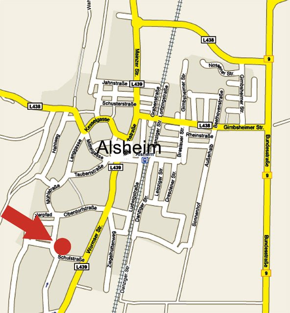 Sie befahren die Umgehungsstraße und fahren aus dem Kreisel nach Alsheim. Sie befahren die Mainzer Straße, die in die Bachstraße und anschließend in die Wormser Straße mündet. Kurz vor Ortsausgang biegen Sie rechts in die Schulstraße ein.